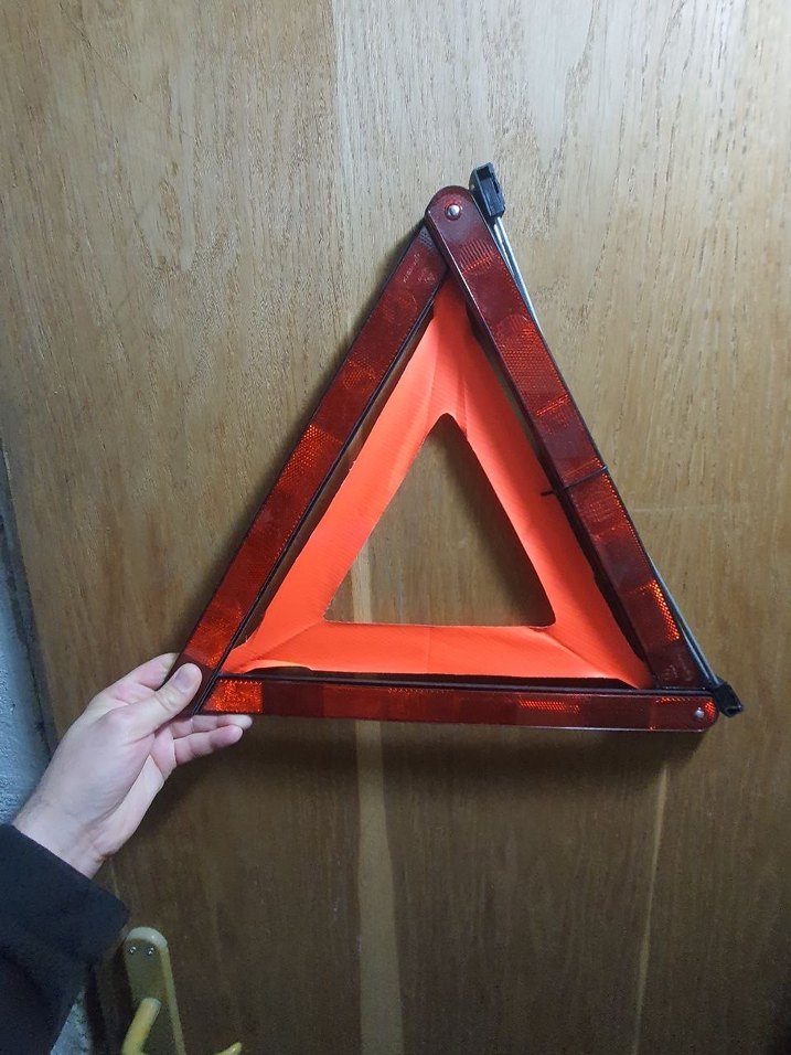Katlanabilir, kırmızı reflektörlü üçgen uyarı levhası, görünürlük ve güvenlik için tasarlanmıştır.