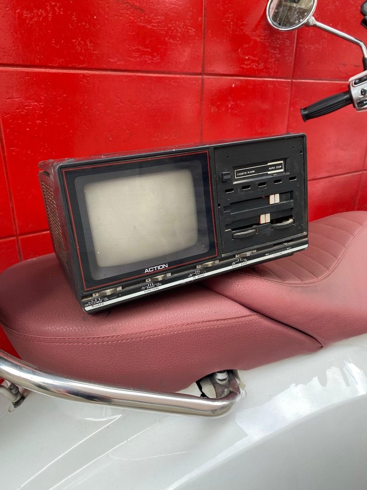 Küçük ekranlı, kaset ve kontrol düğmelerine sahip kırmızı renk nostaljik CRT monitör.