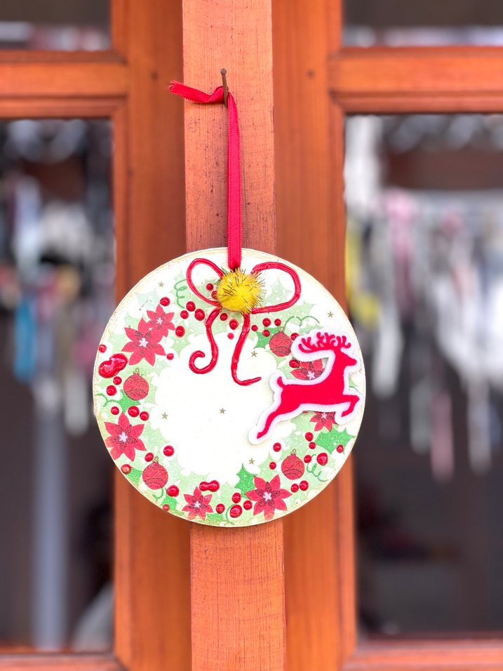 Kırmızı geyik ve çiçek desenleriyle renkli Noel duvar süsü, kırmızı kurdele ile asılır. Ahşap üç boyutlu . Çap12cm