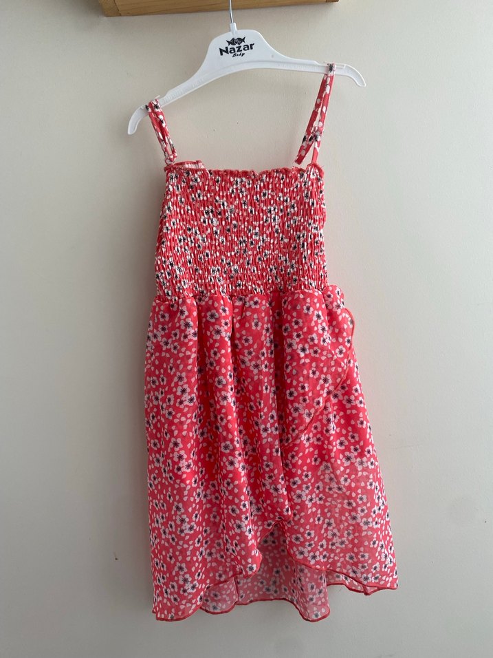Kırmızı renkli, askılı, salaş kesim kız elbisesi, fırfır detaylı ve straplez yakalıdır. Bohem tarzı için uygundur. Hiç kullanılmadı sıfır üründür askıları ayarlanabilir önü kısa arkası uzun modeldir . Marka temsili