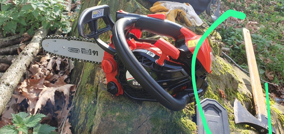Kırmızı renkte, ergonomik tutma sapı ve güvenlik özelliklerine sahip bahçe testeresidir. Kolay kullanımlı kontroller ve net ekranı vardır.