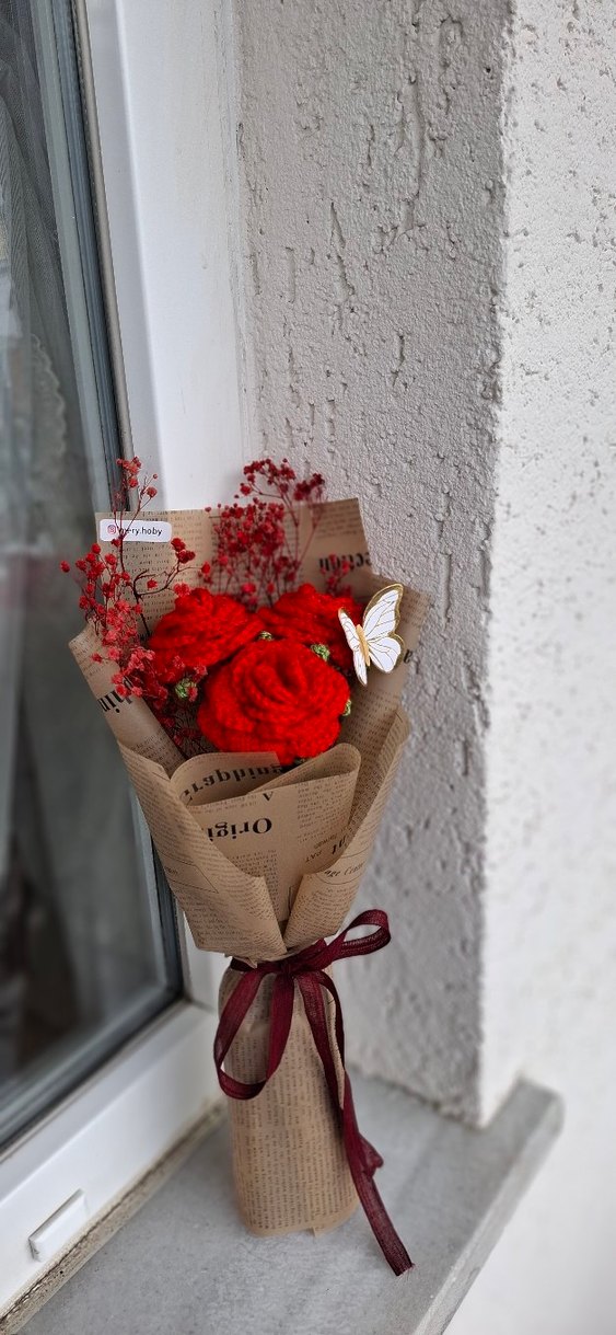 Canlı kırmızı çiçeklerden oluşan, keçe ve kurutulmuş çiçeklerle süslenmiş hediye buketi, keçe kelebek detayıyla tamamlanmıştır.