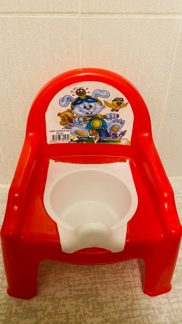 Kırmızı renkli, oyuncaklı desenli sırt dayanaklı, beyaz oturaklı çocuk lazımlık