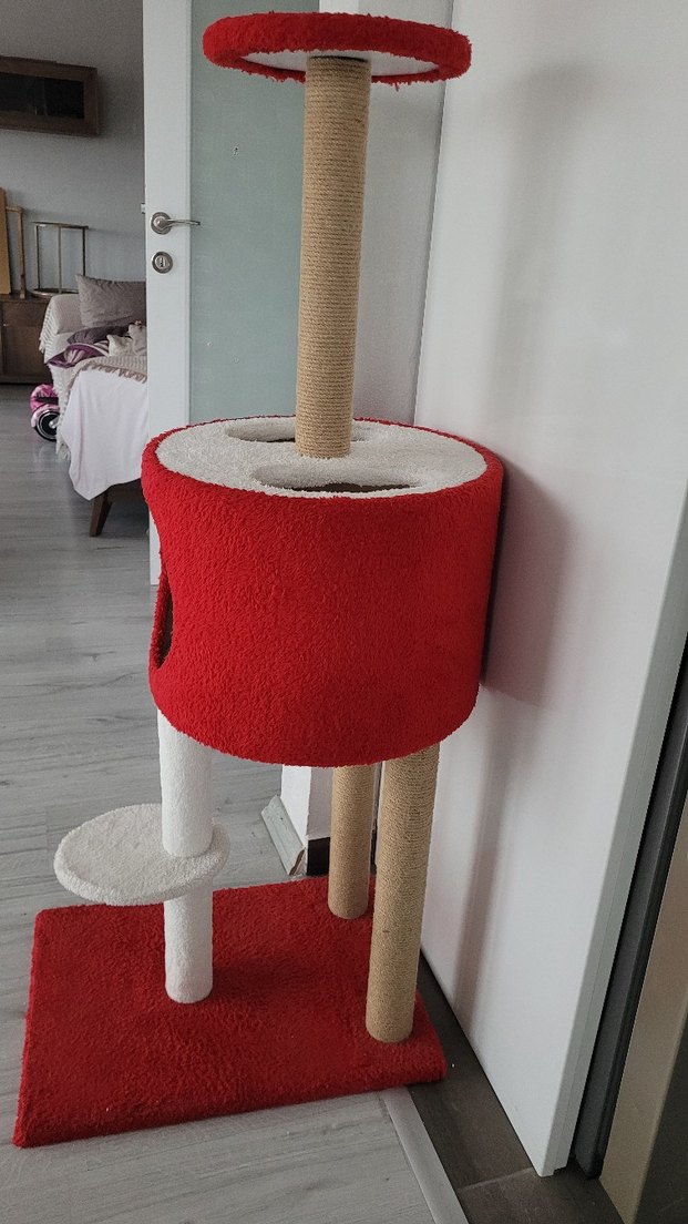 Çok katlı kedi tırmalama tahtası, yumuşak yüzeyler ve doğal lifli tırmalama direkleri içerir. Kırmızı renkli saklanma alanı ve tırmanma platformları bulunur. sakarya