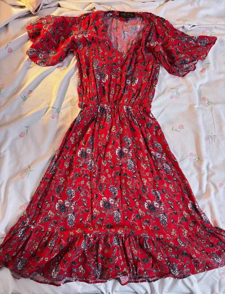 Kırmızı renkli, cottagecore bohem tarzda, volan detaylı uzun elbise. Sentetik kumaştan, kısa kollu, V yakalı ve desenlidir. S bedendir.