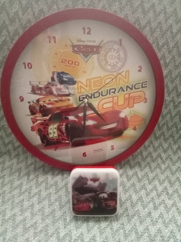 Kırmızı çerçeveli, Disney Cars temalı renkli duvar saati. Saat yüzünde sayılar ve karakter görselleri bulunur. ⏰gece lambası hediye