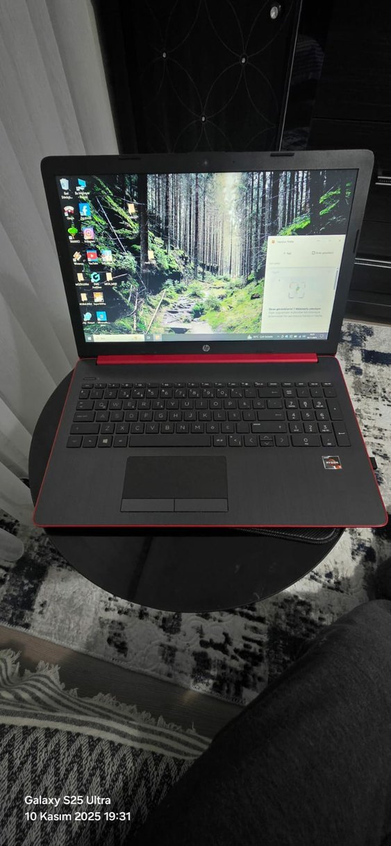 Kırmızı renkte, tam klavyeli ve geniş ekranlı dizüstü bilgisayar. Orman temalı arka plan görüntüleniyor.