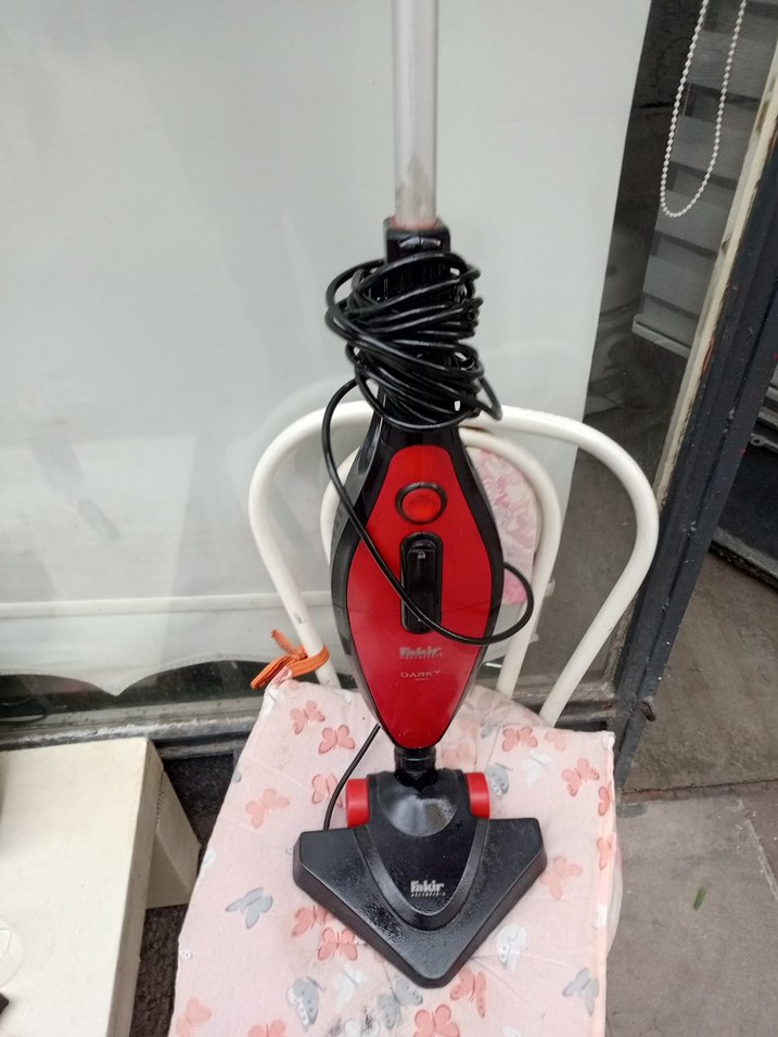 Kırmızı renkte, üçgen tabanlı ve sapında kolay saklama için kablosu sarılı elektrikli süpürge. Önünde bir düğme ve anahtar bulunur.