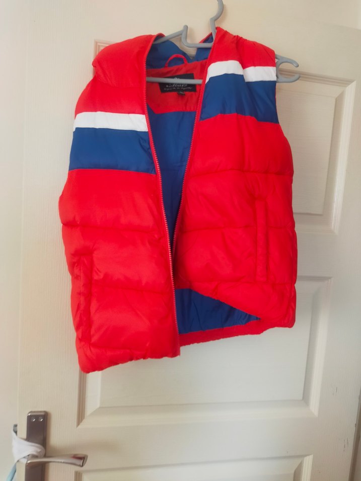 Kırmızı, mavi ve beyaz renkli çizgili, fermuarlı, yüksek yakalı ve Yumuşak ve sıcak dokuda, ve şık görünüm sunar.