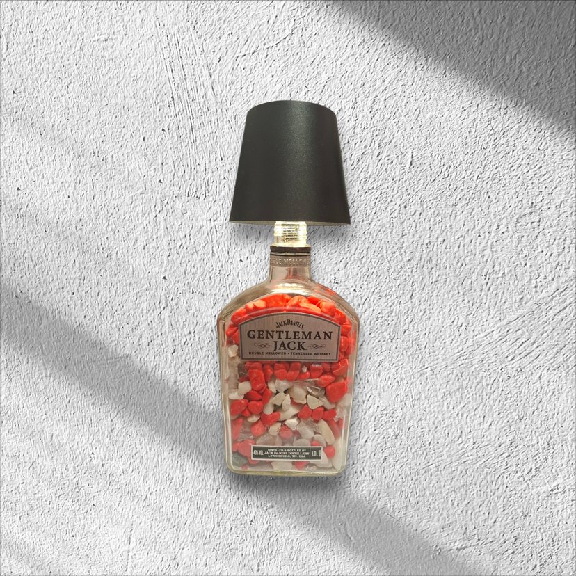 Kırmızı Gentleman Jack şişesi tabanlı, içi taş dolu ve siyah abajurlu renkli masa lambası.