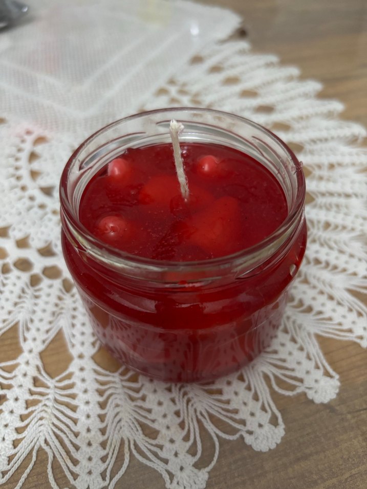 Kırmızı renkte, tek fitilli cam kavanoz çilek reçeli jel mum, renkli ve canlı görünüme sahiptir. Ortama sıcaklık katmak için uygundur. ️