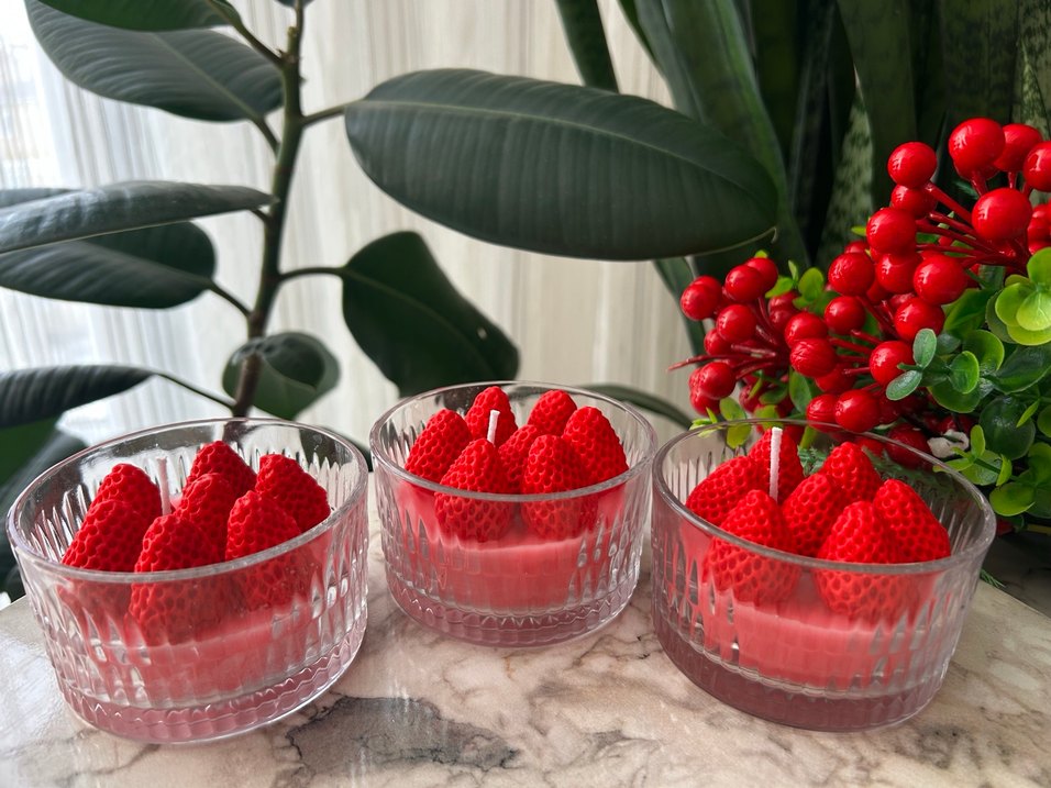 Kırmızı çilek şeklinde dokulu mumlar, şeffaf cam tutucularda sunuluyor. Renkli ve doğal bir görünüm sağlar. El yapımı tekli fiyat