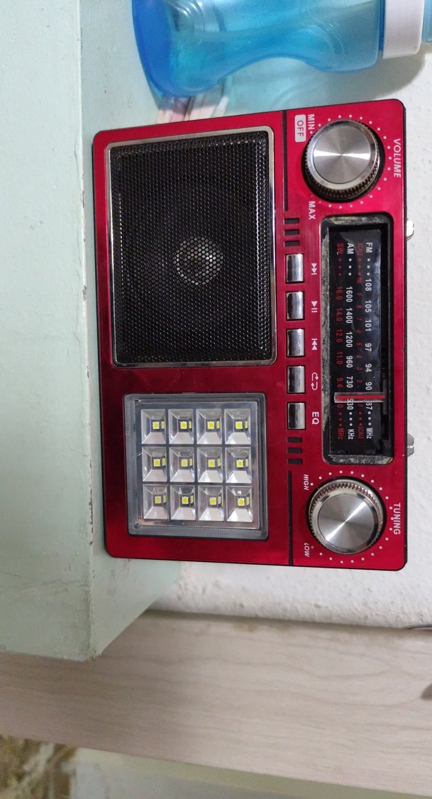 Kırmızı renkte müzik sistemi, dahili hoparlör, ses ve ayar düğmeleri ile LED ışık paneline sahiptir. güneş sistemi FM radyo desteği bulunur. bende şarj cihazı yok bence çalışıyor arkasında pil yeride var öndeki cam yok sadece kutusu yok kablosu yok