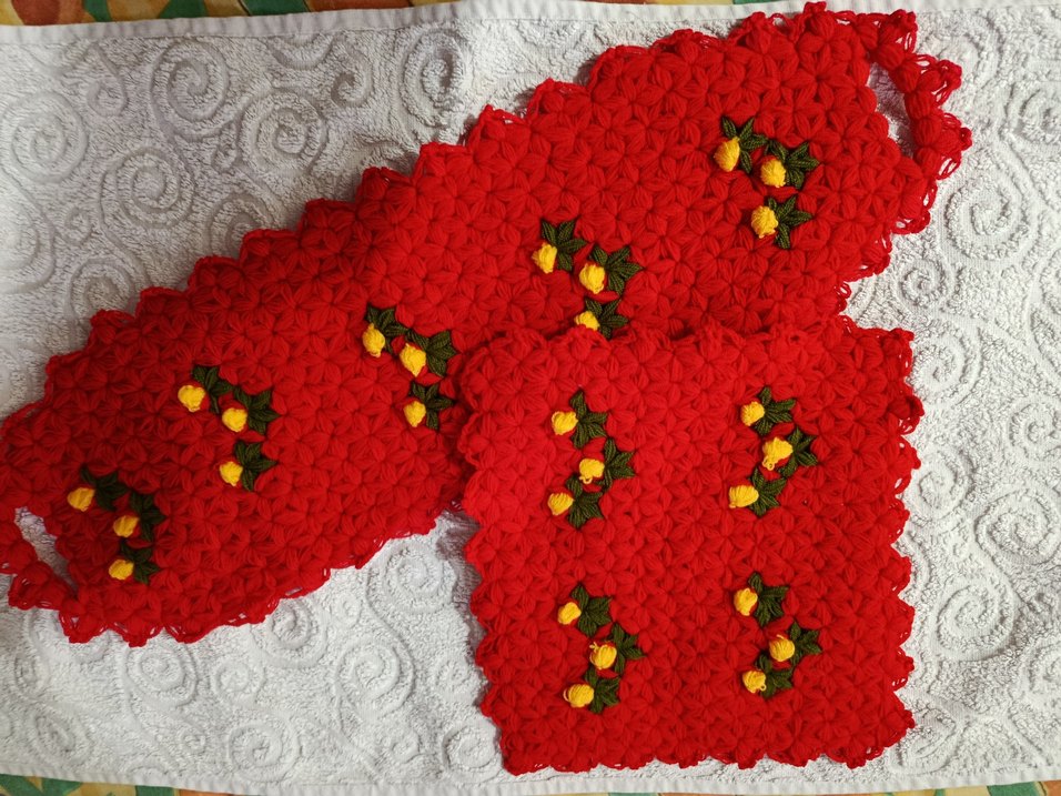 Kırmızı renkli, çiçek işlemeli örgü banyo süngeri, yumuşak temizleme için dokulu yüzeye sahiptir.