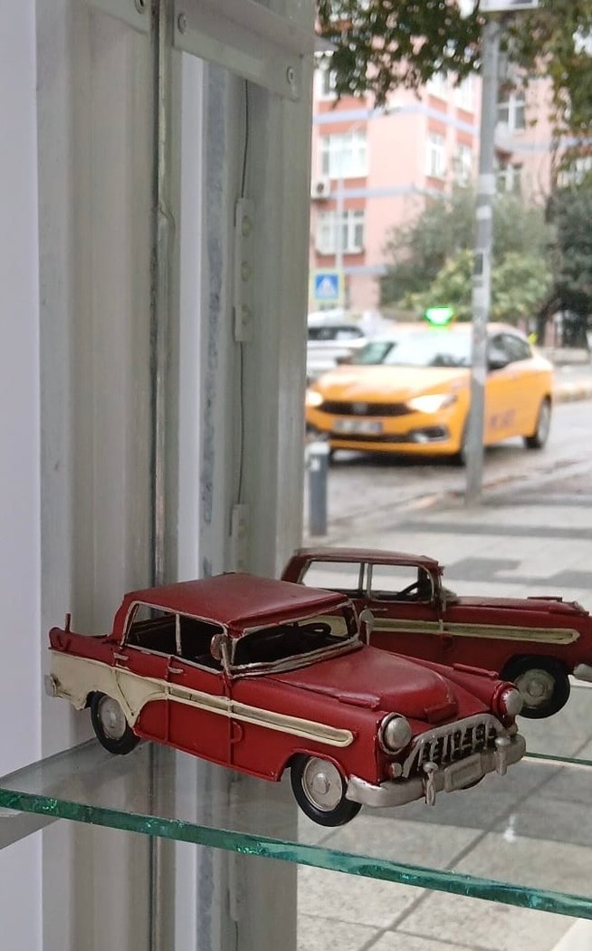 Detaylı camları ve tekerlekleri olan kırmızı renkli, renkli oyuncak araba modeli.