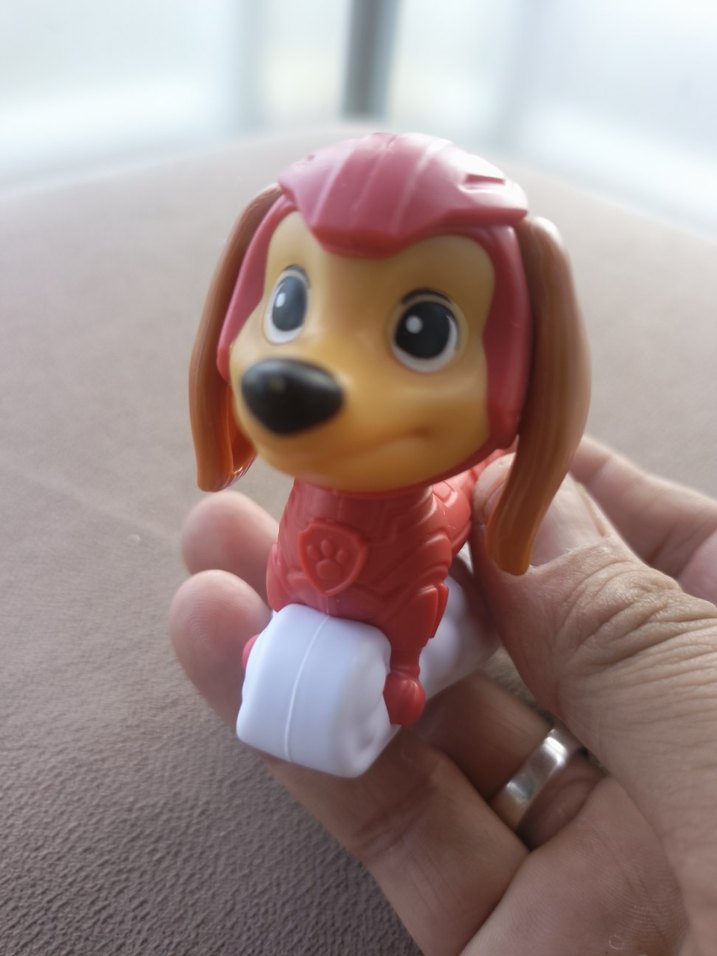 Canlı renklerde, kırmızı köpek figürü beyaz tekerlekli, oyuncak veya koleksiyon için uygundur.