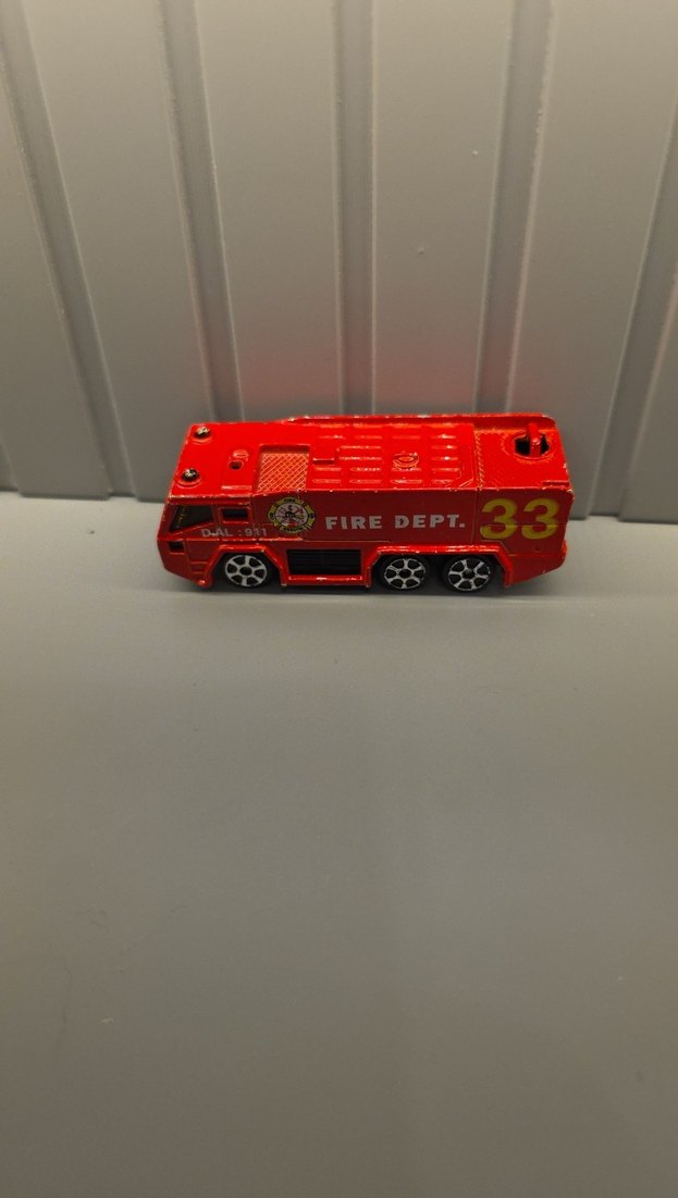 'FIRE DEPT. 33' yazılı detaylı kırmızı renkli oyuncak itfaiye aracı, altı tekerlekli ve kompakt tasarımlı.
