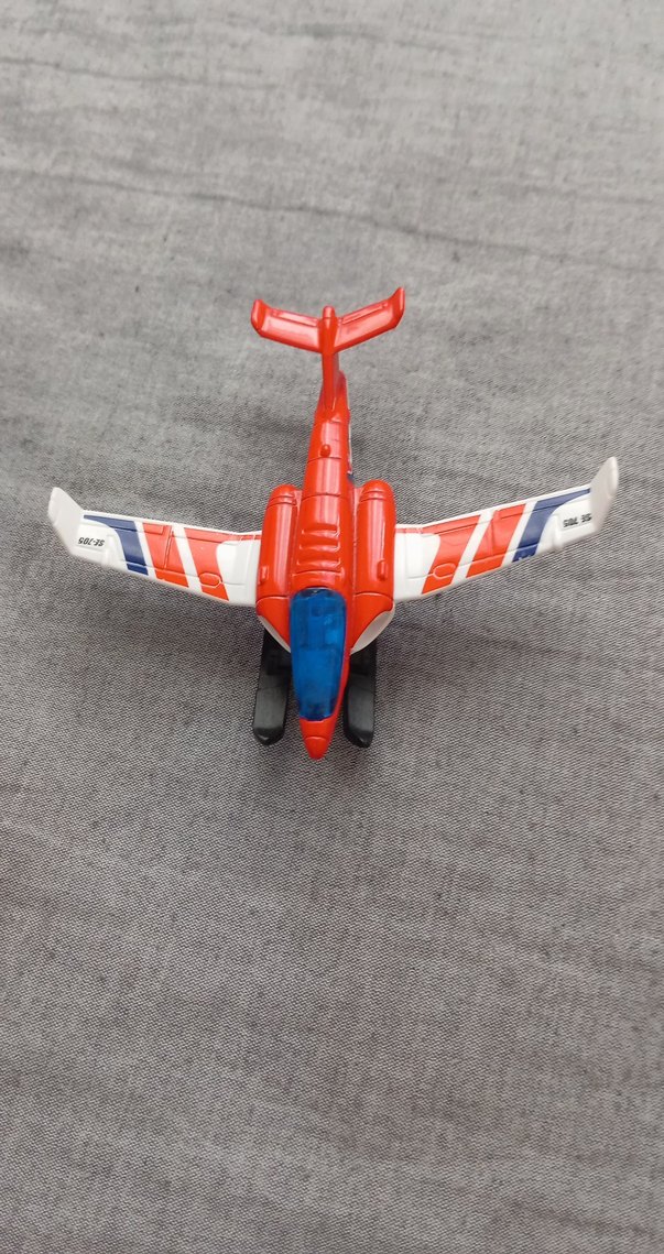 Kırmızı renkli oyuncak uçak, detaylı kanatları ve mavi kokpit ile küçük bir aksiyon figürüdür. ✈️