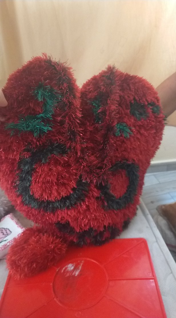 Bu renkli peluş oyuncak kalp, kırmızı tonlarda yeşil ve siyah detaylara sahip yumuşak ve tüylüdür. Eğlenceli ve rahat bir tasarıma sahiptir.