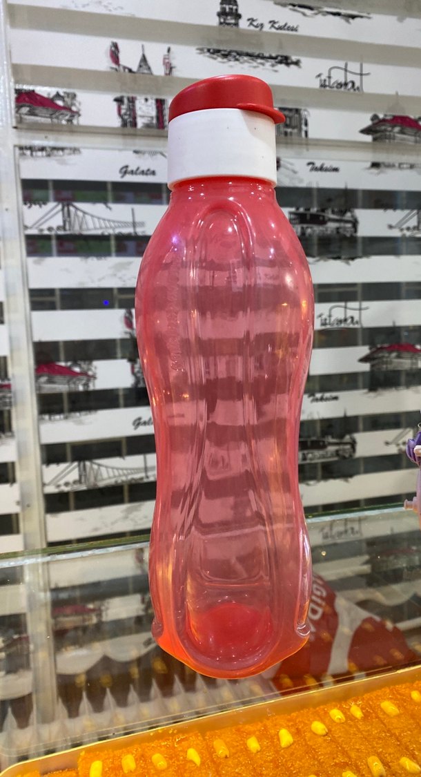 Canlı kırmızı renkte, beyaz ve kırmızı kapaklı plastik su şişesi. Kolay tutuş için şekillendirilmiş gövdesi bulunur 750 ml dir .