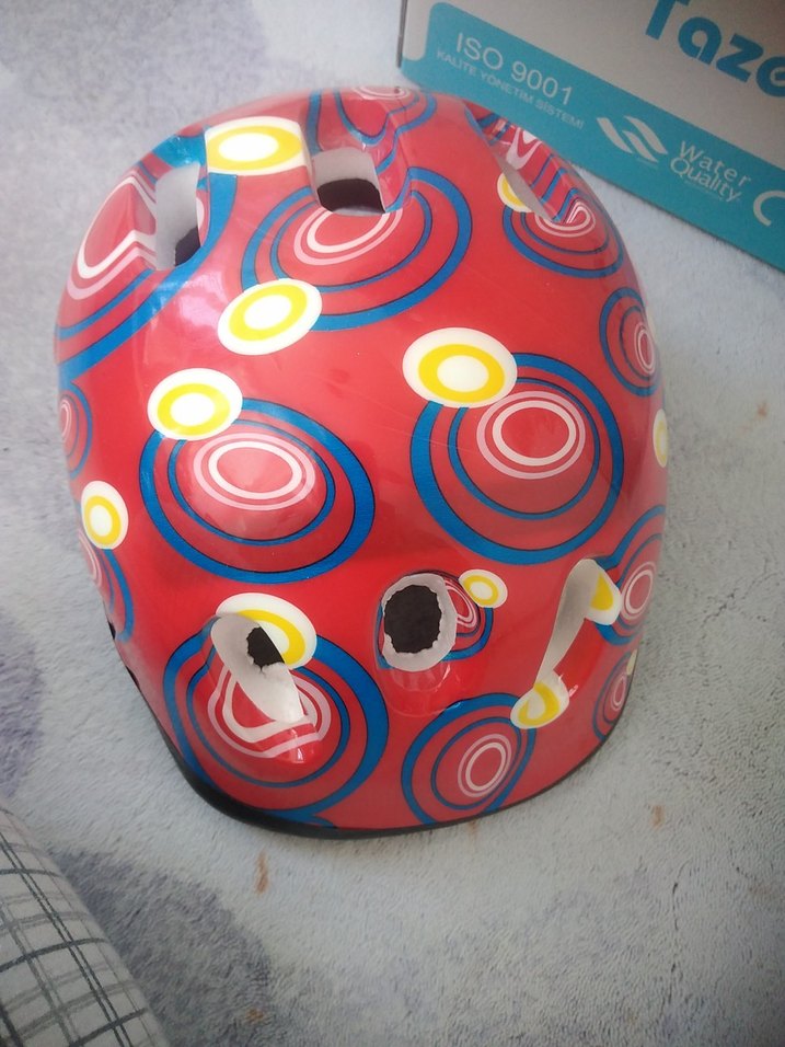 Kırmızı renkte, renkli puantiyeli desenli, tokalı plastik motosiklet kaskı. ISO9001 sertifikalıdır.