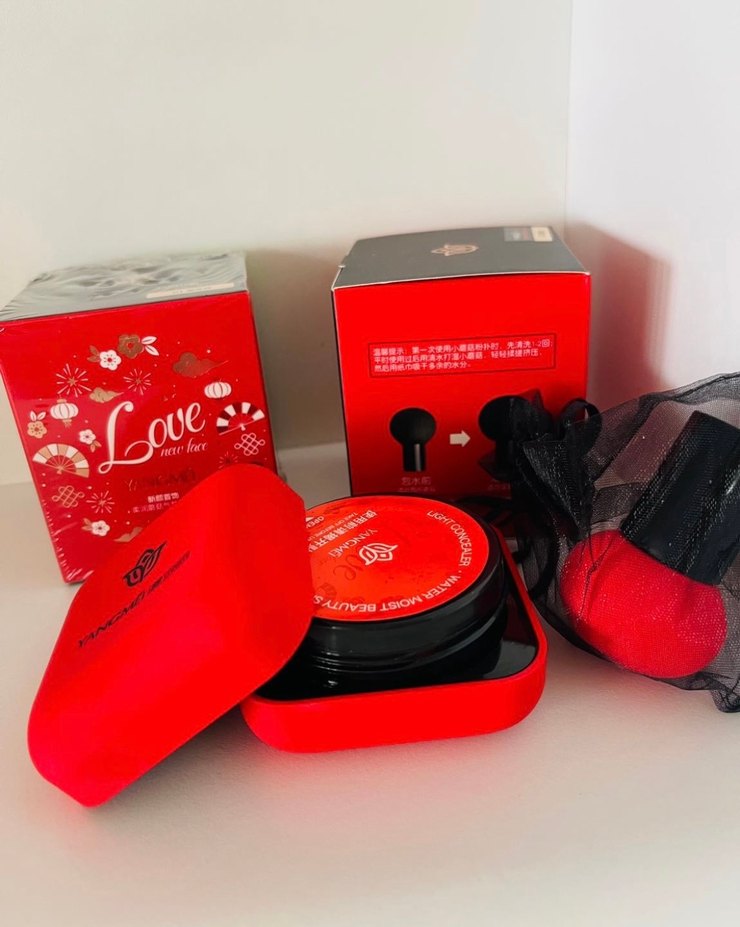 Kırmızı renkli pudra seti, kompakt kutu, dekoratif ambalaj ve file torba içerir. Canlı kırmızı tonu dikkat çeker.