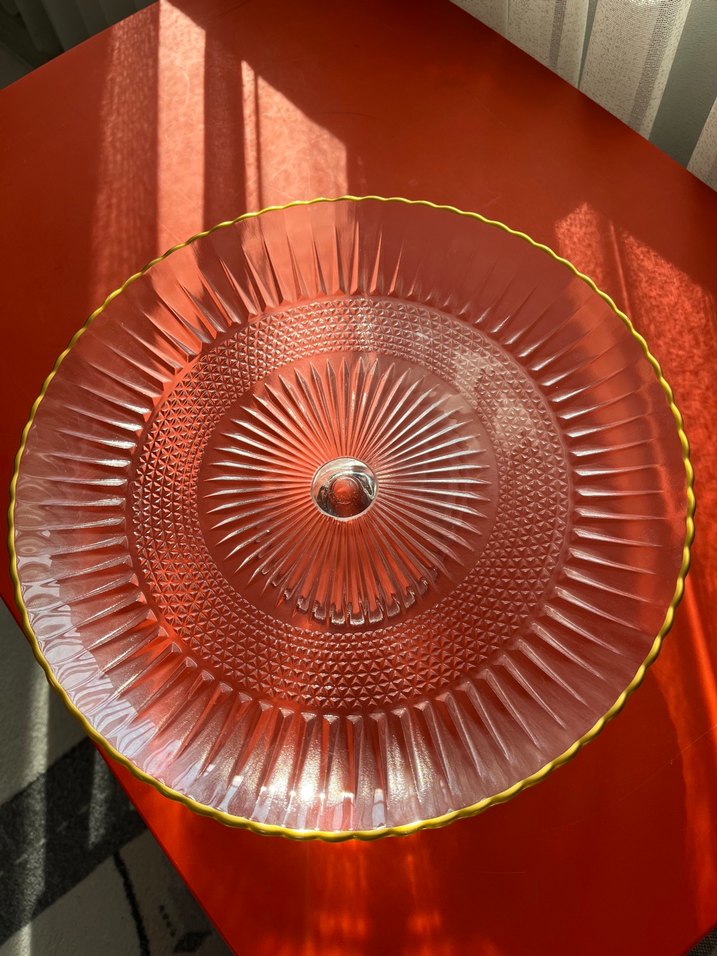 Kırmızı renkte, soyut desenli ve dokulu detaylara sahip renkli cam tabak. ️