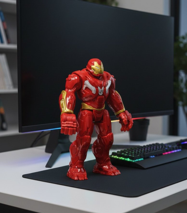 Detaylı zırh ve hareketli eklemlere sahip, canlı kırmızı renkte süper kahraman figürü.