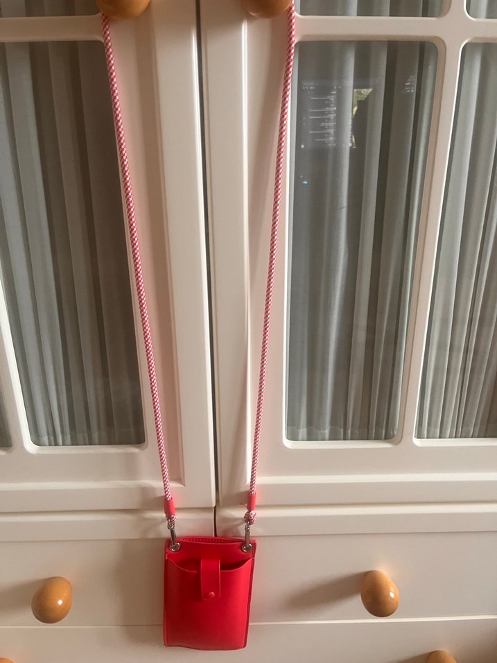 Canlı kırmızı renkte, uzun askılı telefon tutucu ve cüzdan işlevini rahatlıkla görür.