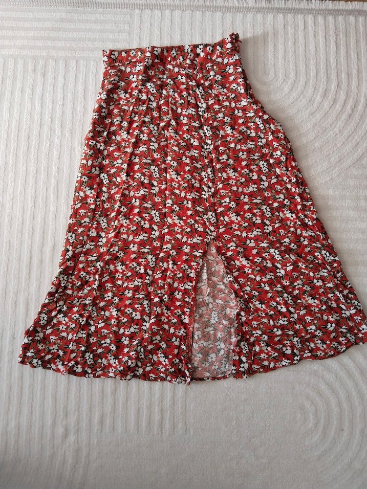 Kırmızı uzun midi etek, bol kesim ve fırfır detaylarıyla bohem tarzında. Yumuşak sentetik kumaştan üretilmiştir.