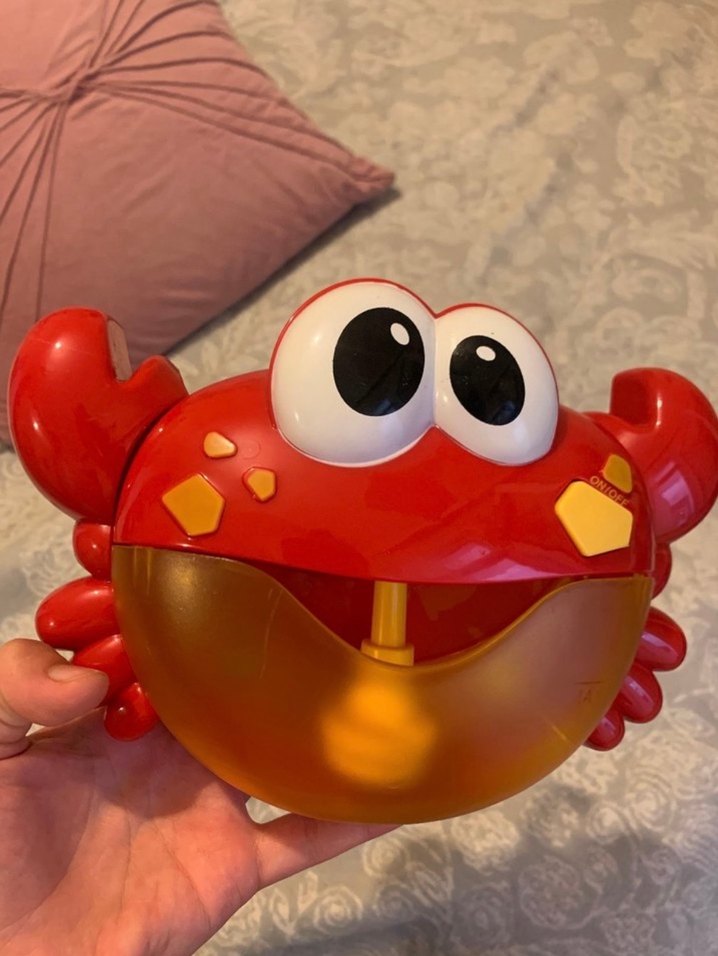 Büyük gözlü ve ağzında dönen parçası olan kırmızı renkli yengeç su oyuncağıdır.