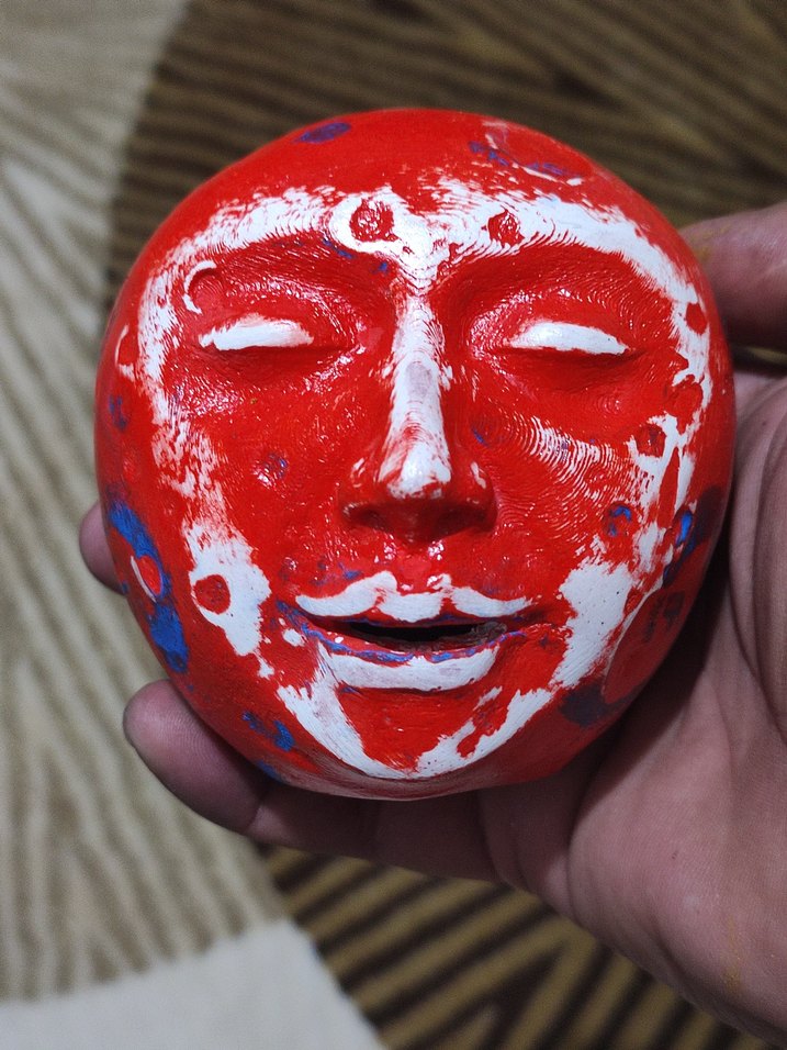 Beyaz ve mavi detaylı, kırmızı renkli yüz şeklinde renkli bir figürin. Dokulu yüzeyi ve sakin ifadesi vardır.