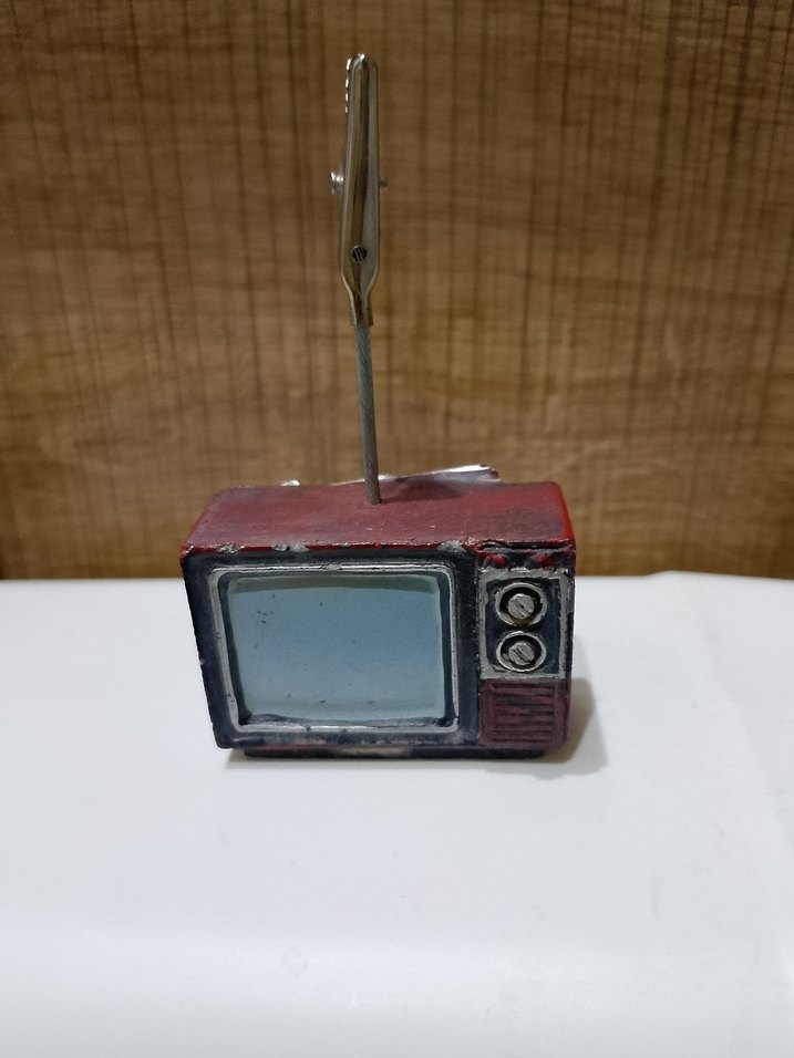 Kırmızı renkte, üstünde not veya fotoğraf tutucu klips bulunan retro tarz mini televizyon monitör. Küçük ekran ve iki kontrol düğmesi yer alır.