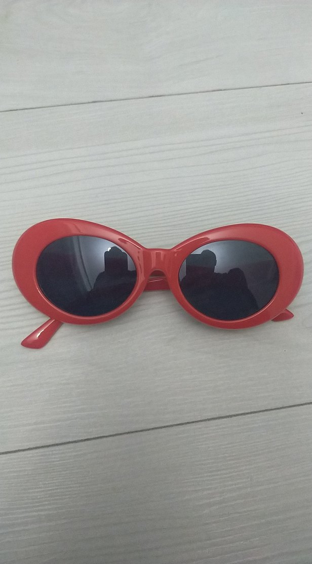 Kırmızı oval çerçeveli, transparan ve renkli retro tarza sahip kadın güneş gözlüğü. Bohem ve hippie stiline uygun. ️