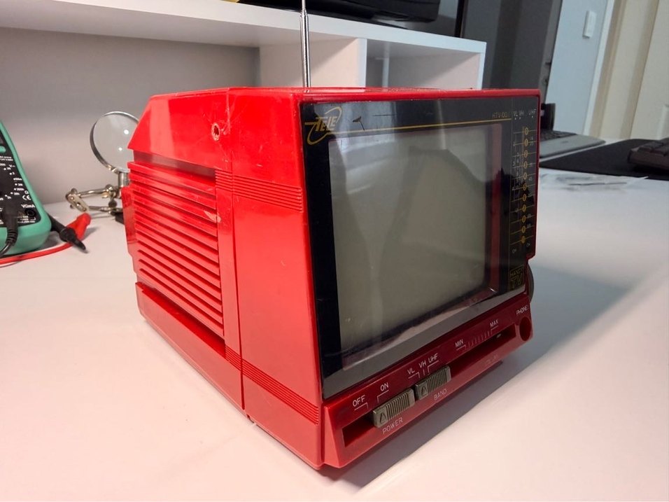 Kırmızı renkli, ön panelde kontrol düğmeleri ve üstte açılır anten bulunan retro televizyon monitörü.