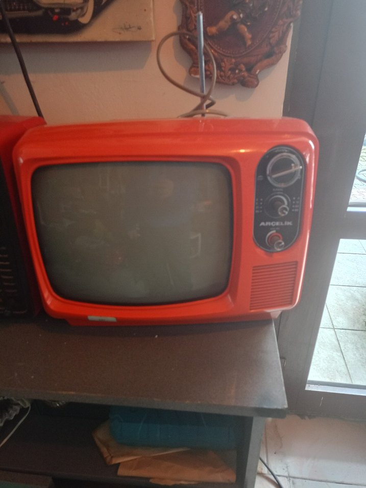 Kırmızı renkte, yuvarlak ekranlı ve manuel kontrol düğmeli retro televizyon monitörü.