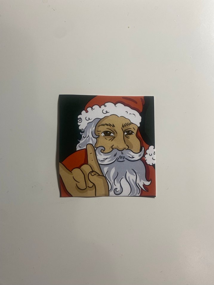 Koyu kırmızı renkli, Noel Baba figürlü ve rock işareti yapan bir stickerdır