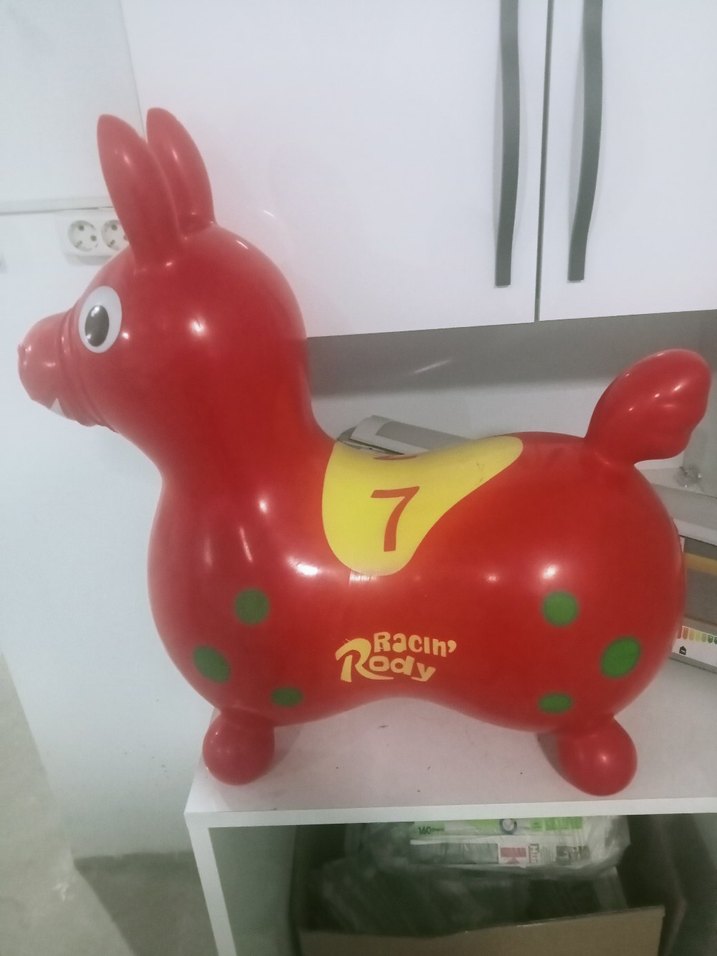Kırmızı Rody oyuncak at, yeşil benekler ve 7 numaralı sarı eyer ile renkli tasarıma sahiptir. Zıplamak için uygundur.