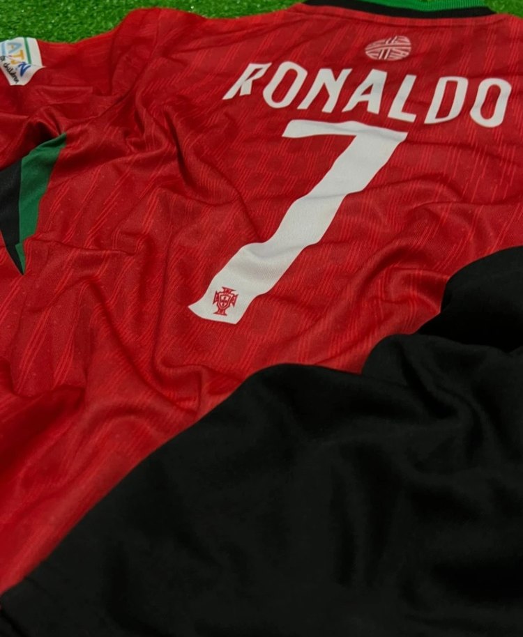Kırmızı, baskılı ve sentetik kumaştan yapılmış, kısa kollu ve bisiklet yakalı, vücuda oturan erkek spor forması. Velcro detaylı, spor ve sokak stiline uygun. "RONALD" yazılı ve 7 numara bulunur. ⚽