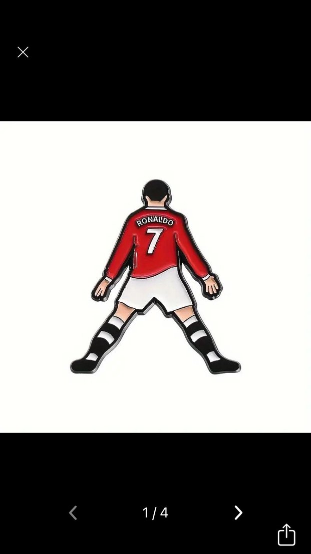 Kırmızı forma ve 7 numarasıyla Ronaldo figürlü, renkli ve cesur pop kültür tarzında erkek rozeti. ⚽