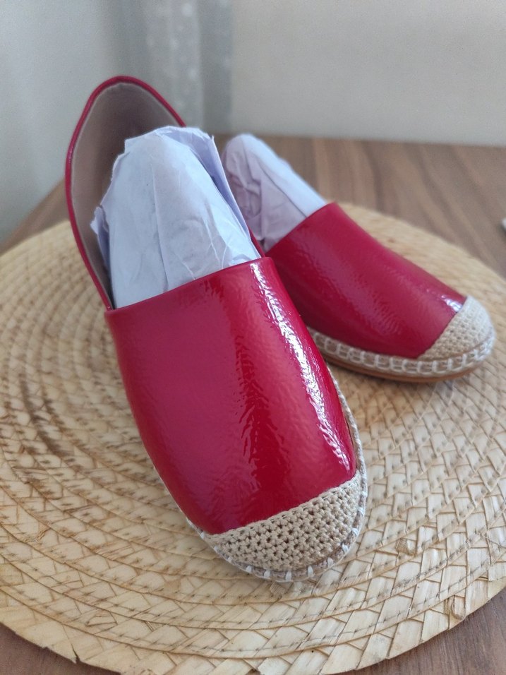Kırmızı rugan kadın espadril, kauçuk tabanlı, günlük rahat kullanıma uygun parlak ve renkli tasarım. ürünün geliri depremzede aileye verilecektir indirim talep etmeyiniz.