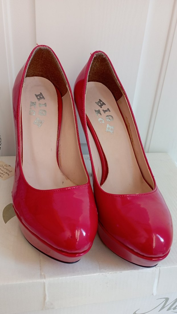 Rugan kırmızı, parlak yüzeyli platform topuklu 36 numara ayakkabı. Çok temiz.