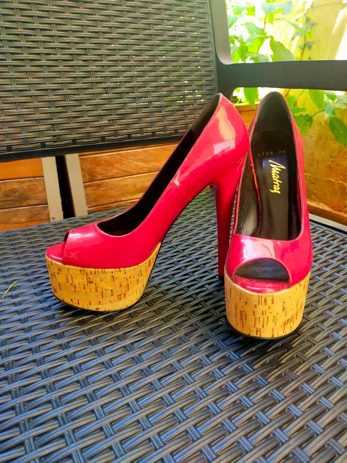 kırmızı rugan yüzeyli, mantar desenli tabanlı platform topuklu ayakkabı. Sokak stiline uygun, cesur ve renkli tasarım.