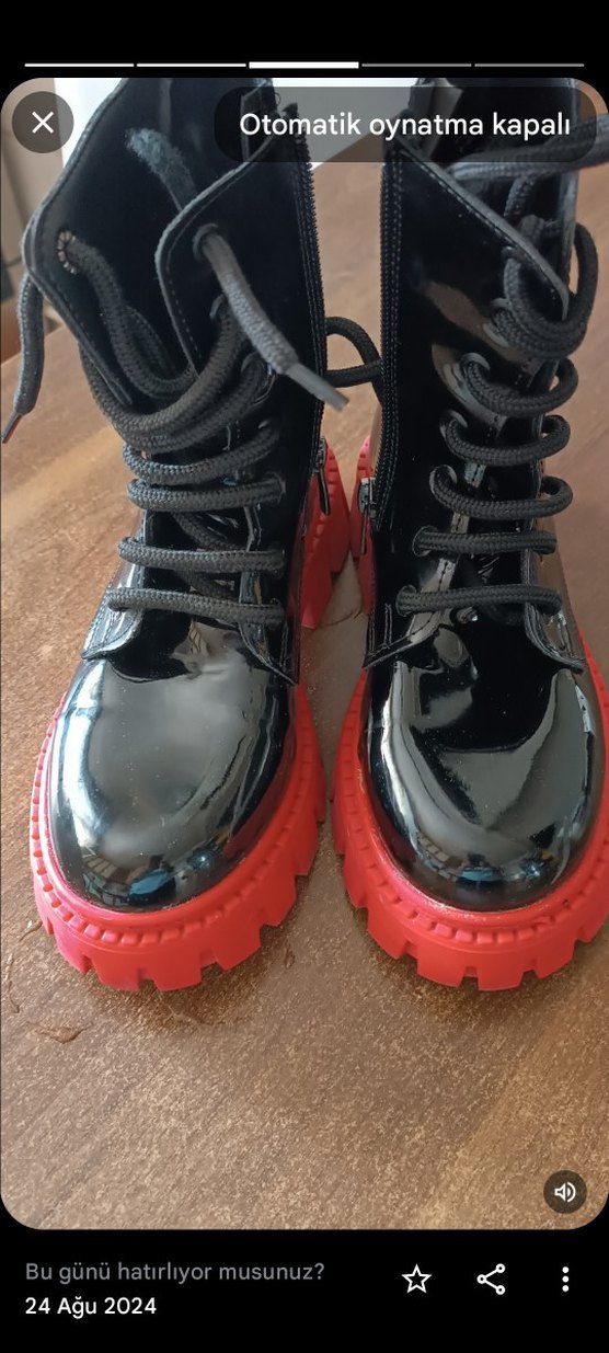 Parlak siyah üst kısmı ve canlı kırmızı kauçuk tabanlarıyla gotik tarzda kadın botları. Cesur ve yenilikçi bir görünüm sunar.