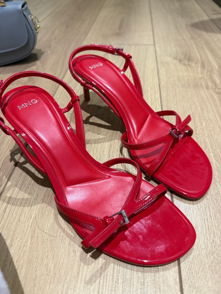 Parlak kırmızı rugan malzemeden, tokalı ince topuklu kadın sandalet. Minimalist ve çağdaş tasarımıyla cesur ve romantik akşamlar için uygun.