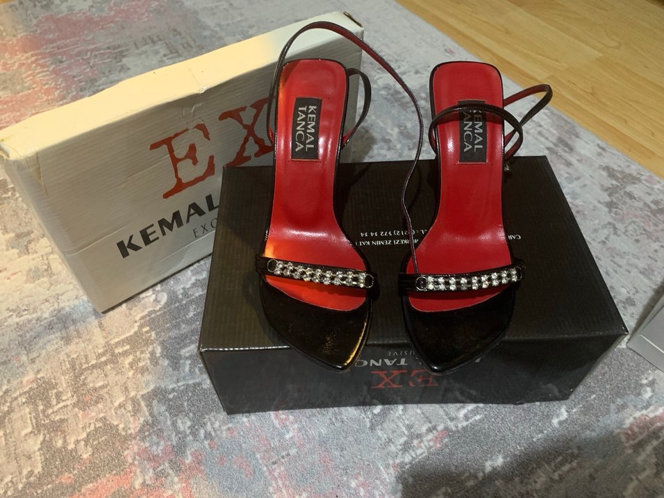 Koyu kırmızı renkli, tokalı ve taş detaylı bantlı yüksek topuklu abiye ayakkabılar. Lastik malzemeden, gotik ve gösterişli tarz için uygundur.