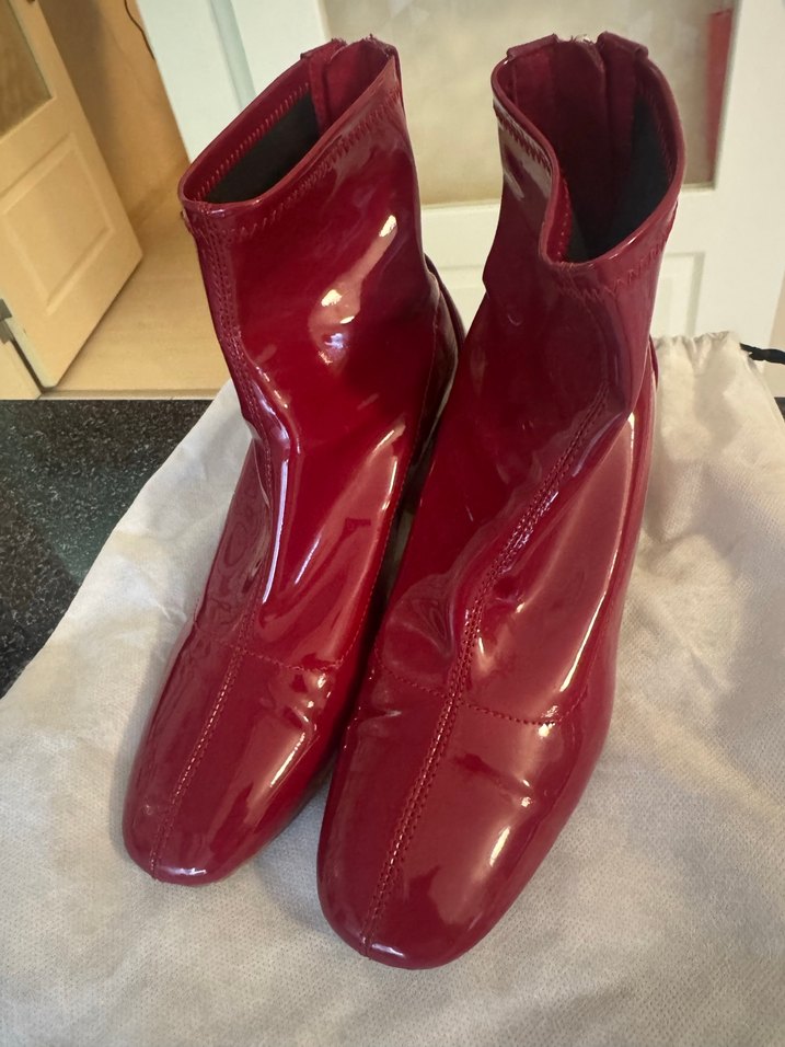 Kırmızı rugan deri, parlak yüzeyli kadın botları, stiletto topuklu. Romantik gece ve sokak modasına uygun şık tasarım.