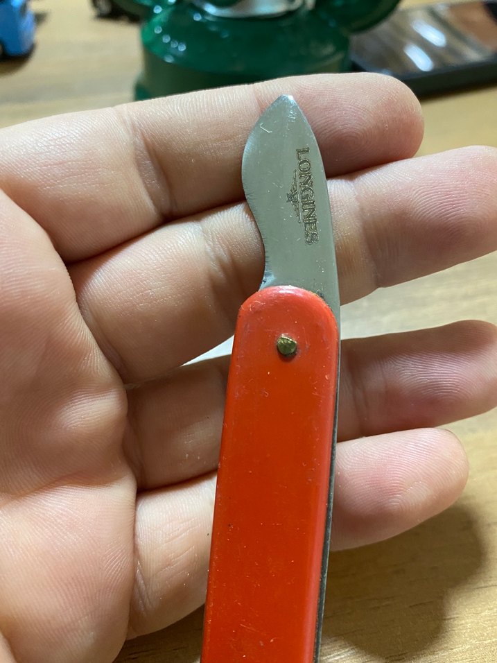 Küçük katlanabilir bıçak, koyu kırmızı sap ve paslanmaz çelik bıçağa sahip. Longines marka yazılı.