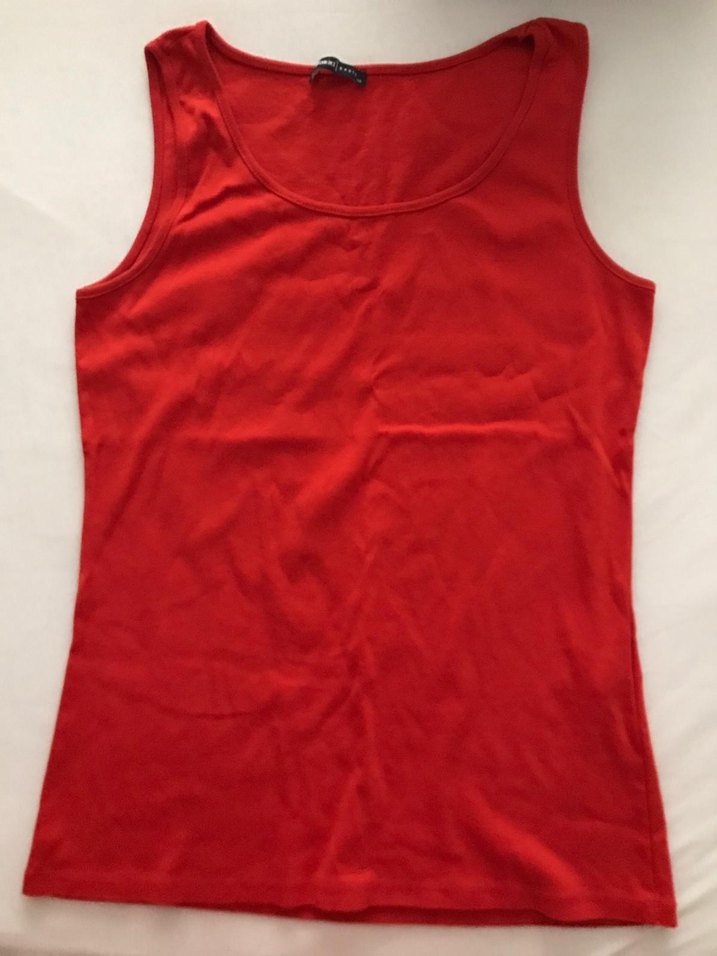 Parlak kırmızı renkte, bisiklet yaka olan kadın atlet. Sentetik, pürüzsüz kumaştan, spor ve sokak modasına uygun.