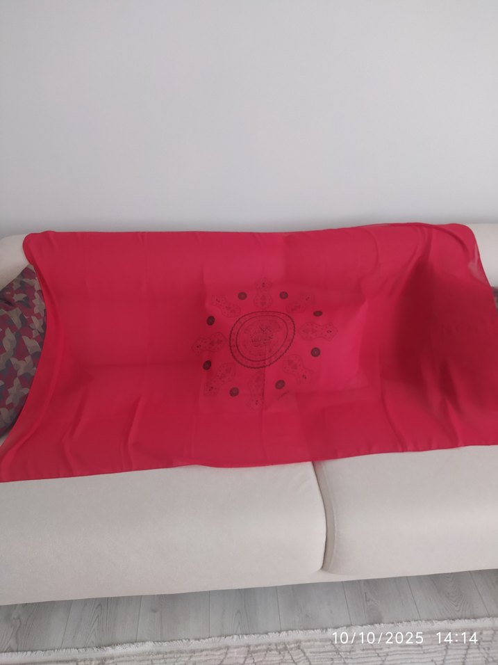 Koyu kırmızı renkte, baskılı medine ipeği kumaşıyla kırışmayan bi şaldır